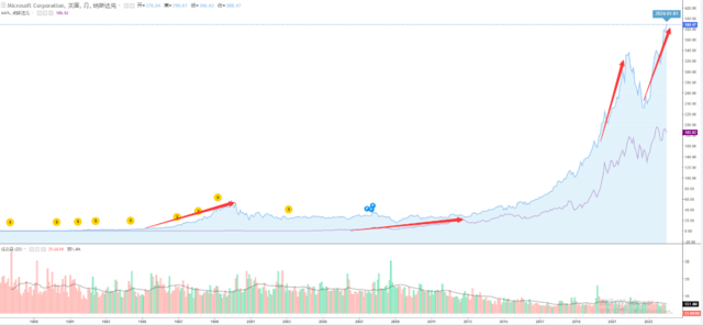 在现任CEO纳德拉的领导下,微软云计算业务从2018年开始蓬勃发展,2020-2021年疫情期间,iPhone生产因工厂关闭和供应问题而中断,微软市值凭借在云计算方面的领先优势短暂地超越苹果。